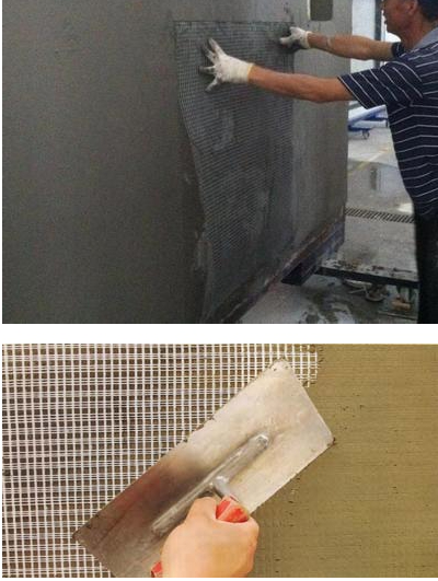 干净容器中装清水后加入本品,加入干粉的同时用电动搅拌器搅拌至均匀浆体,待拌合物静置5分钟,再略为搅拌后即可使用。施工将搅拌好的聚合物抗裂砂浆均匀的刮涂在i混凝土墙上、玻化微珠砂浆上或聚苯板上约2 mm,然后将耐碱玻纤网格布(热镀锌钢丝网)用专用的抹子将其压入胶浆中,待干固后进行第二道胶浆罩面,完全覆盖玻纤布(钢丝网),胶浆保护层总厚度约为3mm。如为了提高首层墙体抗冲击等能力,应外加一层网格布,重复以上工序,总厚度约为3.5mm。养护施工后6小时内避免刮划、淋雨。