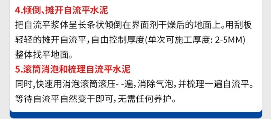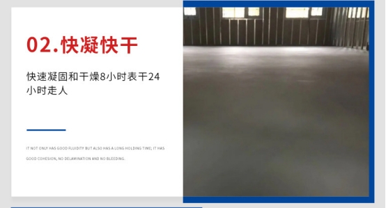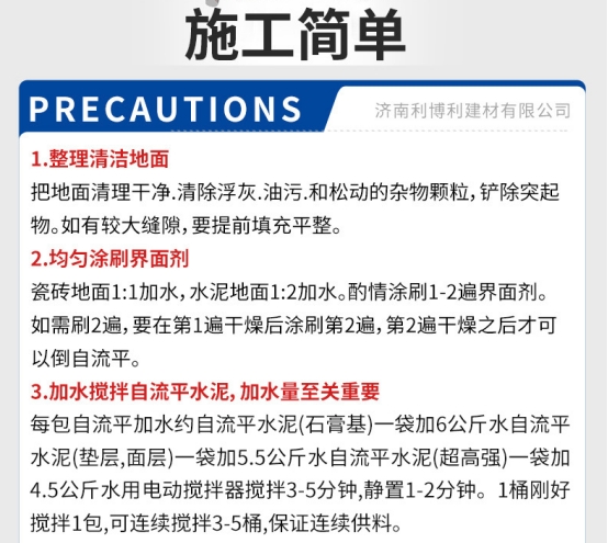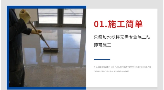 1、施工简单易为,加适量的水即可形成近似自由流体浆料,能快速展开而获得高平整度地坪。