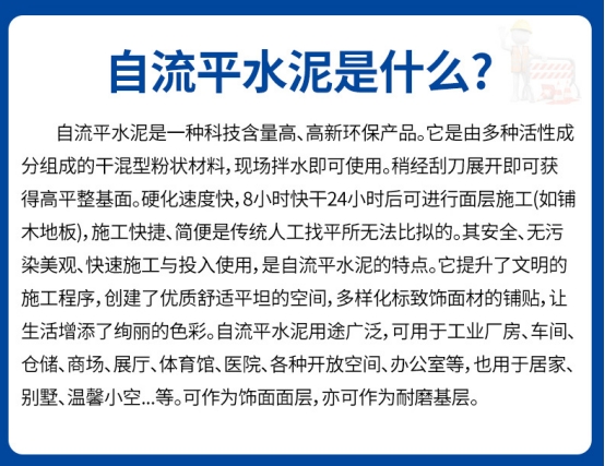 它是由多种活性成分组成的干混型粉状材料,现场拌水即可使用。稍经刮刀展开,即可获得高平整基面。硬化速度快,24小时即可在上行走,或进行后续工程(如铺木地板、金刚板等),施工快捷、简便是传统人工找平所无法比拟的。
