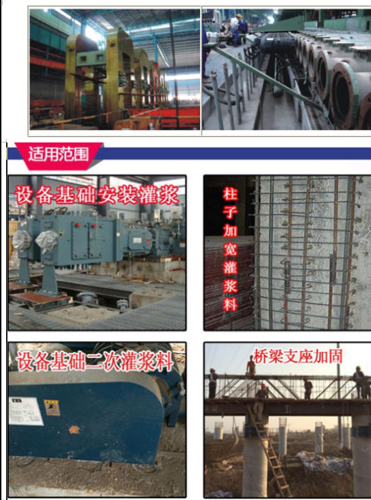 1、适用于压缩机、泵、冲压机、粉碎机、球磨机等高振动性设备的二次灌浆安装以及易受化学侵蚀的设备基础区域灌浆。